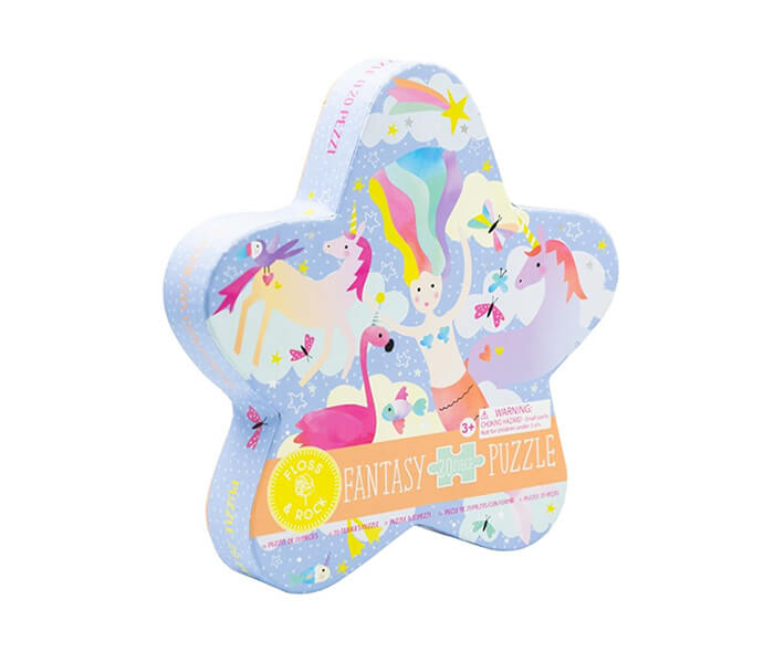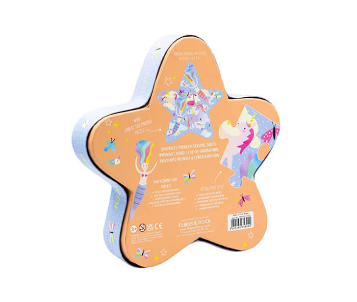 A fun, star shaped jigsaw containing 20 pieces in pastel hues featuring mermaids with rainbow hair, unicorns, butterflies, flamingos and more. Both the puzzle and the box have shiny foiled details.
