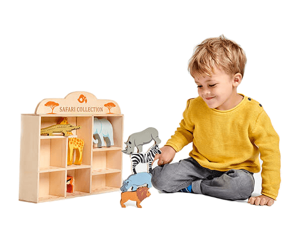 A collection of gorgeous, wooden, safari animals presented in a wooden shelf with compartments, to fit each animal. Perfect for little hands in small world playtime. The shelf makes for a neat way of tidying away after playtime, and a great addition to any playroom or bedroom. There is even a special feature of animal footprints on the bottom of the shelf compartments, so you can learn which animal makes what shape with their feet!