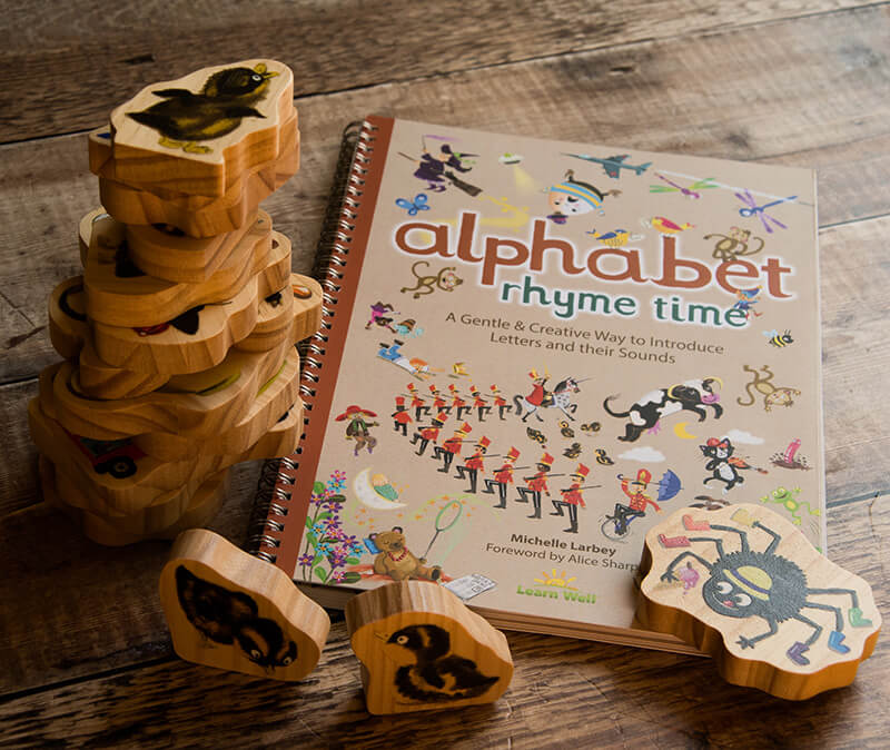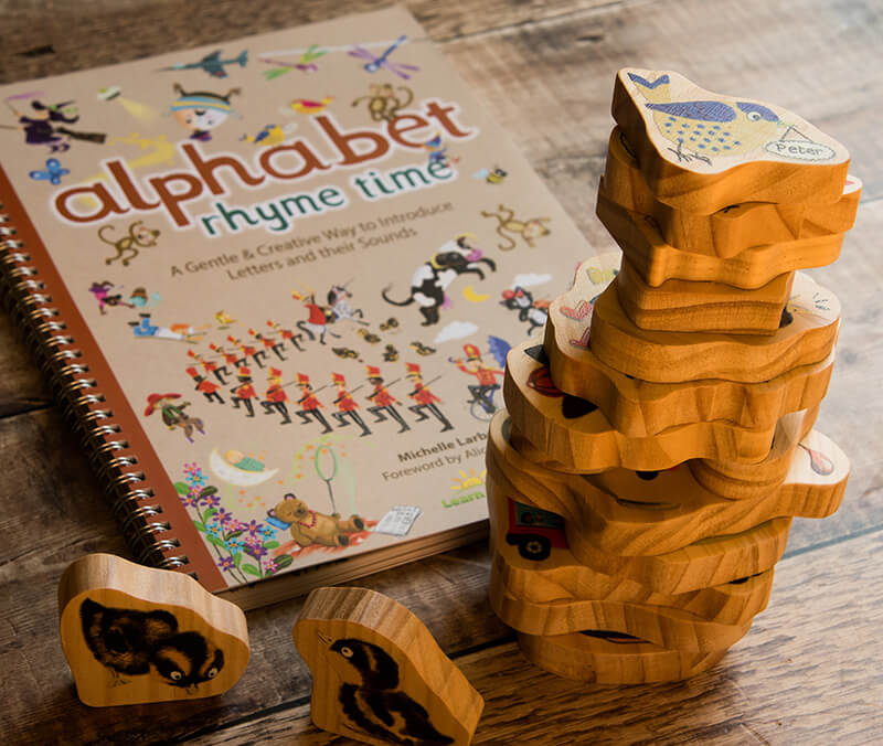 The Alphabet Rhyme Time Book is in full colour with 110 A4 pages. Charcater Set 1 has 8wooden pieces including a bicycle, five ducklings, a bus and a spider. Character Set 2 has 7 wooden pieces which includes a cow, a cat, two birds, a pie, a teapot and a cup.