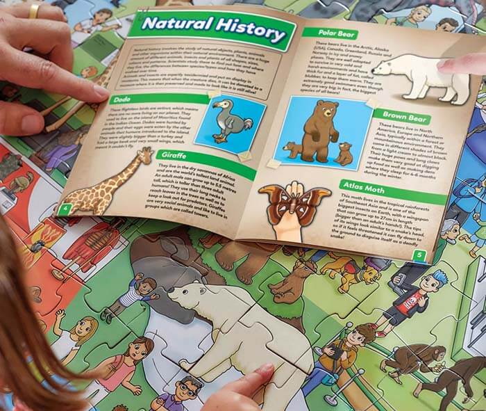 A challenging 150 piece jigsaw, that is beautifully illustrated featuring different museum exhibits from the Romans to the Vikings, Dinosaurs to Space, Human biology and much more! Designed to encourage observation and discussion, with an amazing 16 page fact book to check out key facts and find out more.