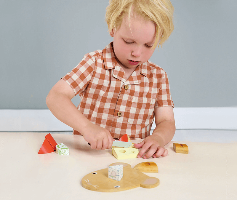 A lovely pretend play mouse-shaped wooden cheeseboard with lots of character. This is such a unique looking chopping set, ready to add to any kitchen set ups.