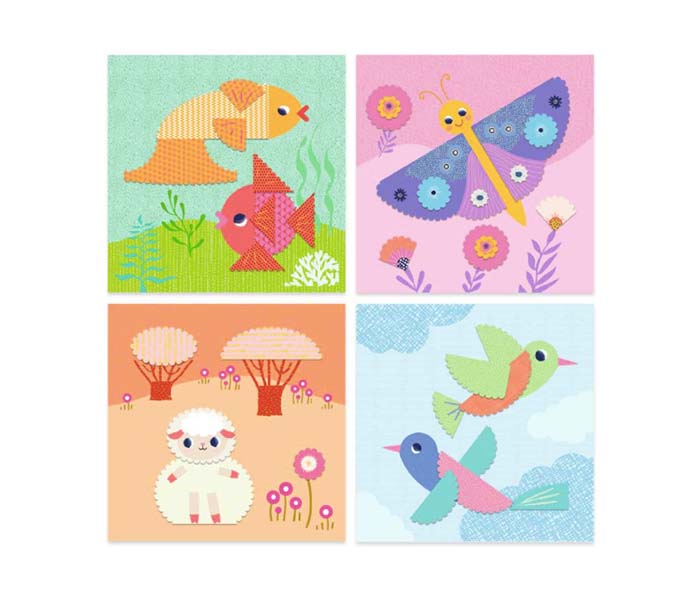 It’s time to start making some cute animal pictures, through this wonderful crafting kit. As a starter set, for little hands, a lot of thought has been put into how the animals can be made and learning to make interesting patterns with the crinkle cut scissors. There are four lovely designs – a sheep, birds, butterfly and fish. Each cuttable sheet has a pattern on the front and the shapes and direction to cut in on the reverse.