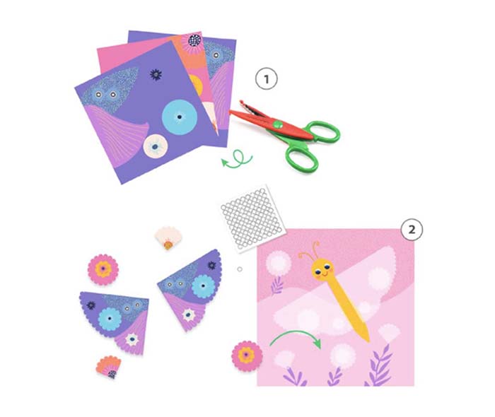 This set includes 9 illustrated sheets to cut out, 4 illustrated cards to decorate, 1 pair of crinkle cut scissors (which cut in 2 styles dependant on direction of cutting), 1 double sided sheet of stickers and a step-by-step instruction booklet.
