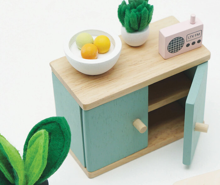 This wooden furniture set includes a modern wooden table with two coordinating chairs and a bench, a free standing lamp, a sideboard, 2 pot plants with realistic felt leaves, a fruit bowl complete with wooden fruit, a radio and to set the table – 4 dinner plates, cups and a showstopper cake arranged on a stand.
