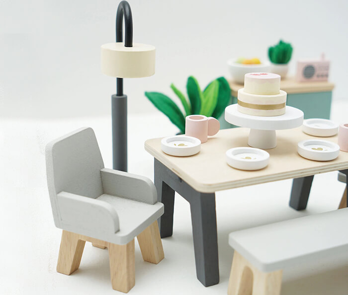 Lets get contemporary, in this stunning toy dining room set, perfect for adding a touch of elegance and sophistication to any miniature home. This eighteen piece set has everything to encourage interactive play and what little dinner guests wouldn’t want to receive the wow factor!