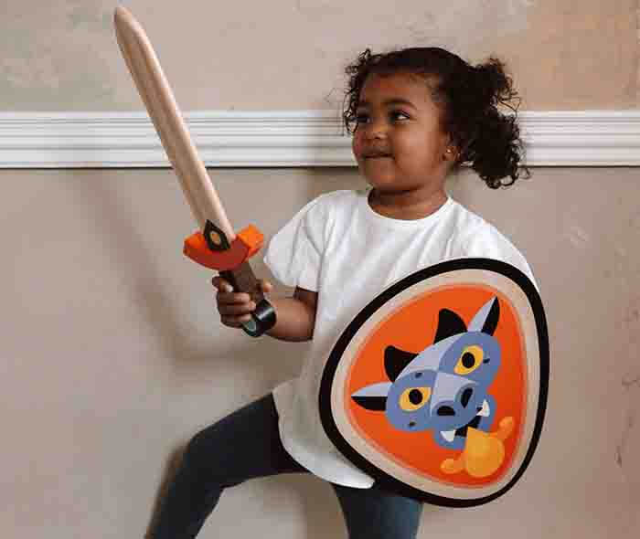Budding knights will love this wonderfully retro dragon sword & shield. Made from sustainable wood, it is an essential for every dressing up box and will ignite the imaginations of hours of pretend play – inside and out.