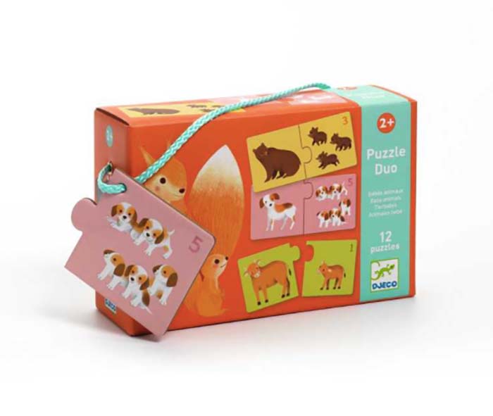 A gorgeous first puzzle, perfect for beginners. Each 2 part puzzle includes a Mummy and a different number of babies, but you need to find the right place for each piece to fit. There are 2 puzzles for each number, so identifying the animals is key to solving the puzzle.