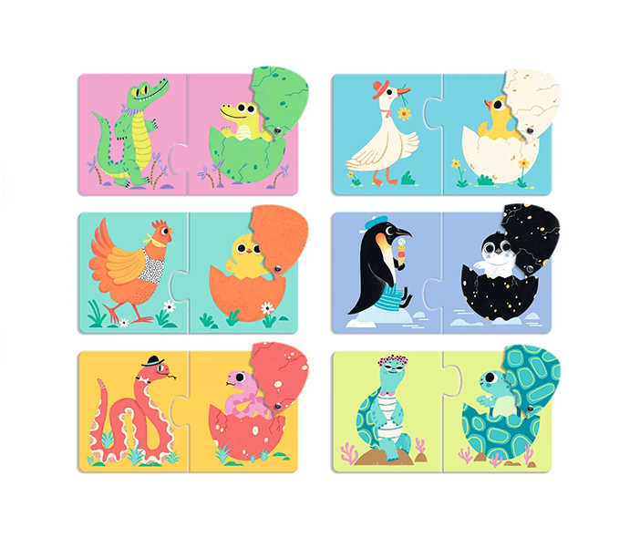 A gorgeous first puzzle, perfect for beginners. Each 2 part puzzle includes an animal that needs to be matched to an egg, but you need to find the right place for each piece to fit. There are 6 puzzles in total, with the egg having a hinge which lifts up to reveal the animals baby inside – peek-a-boo surprise!