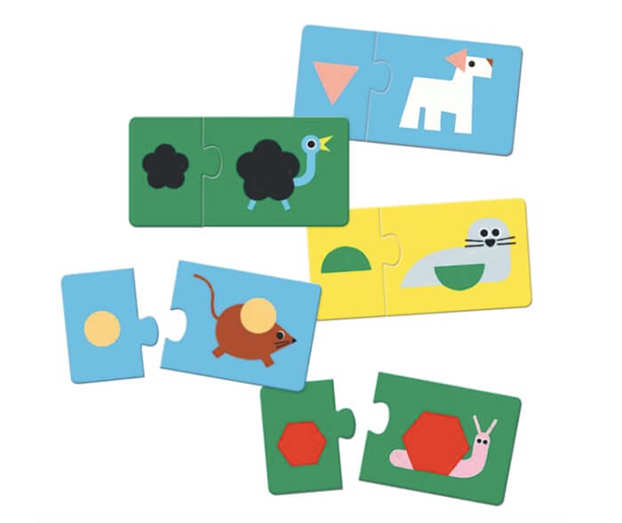 This set includes 6 different 2 piece puzzles. It is also self-correcting, in that each puzzle piece will only fit in the perfect pair.