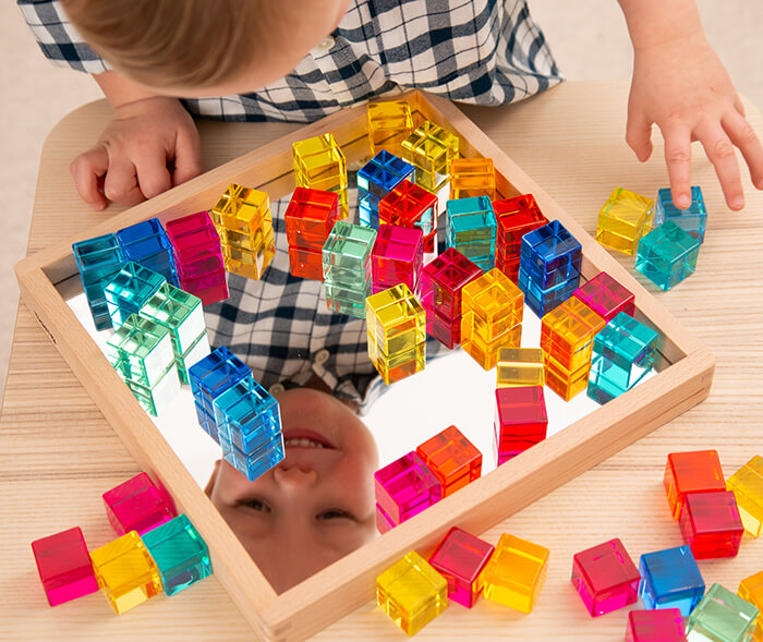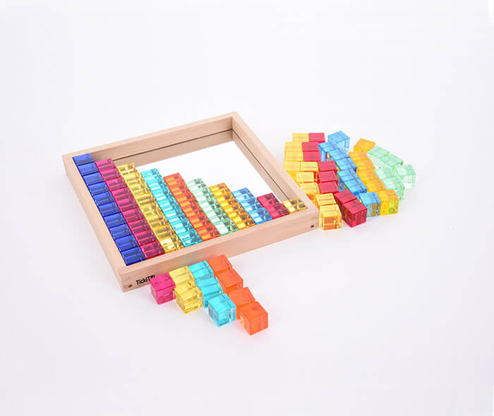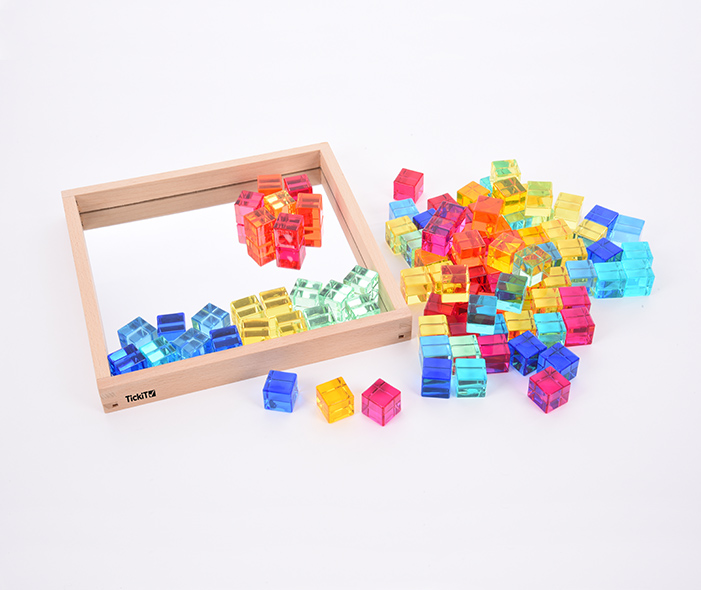 The cubes are made from solid acrylic, beautifully finished with smooth edges and come in 10 different colours. All the pieces can be stored in a mirror tray at the end of play.