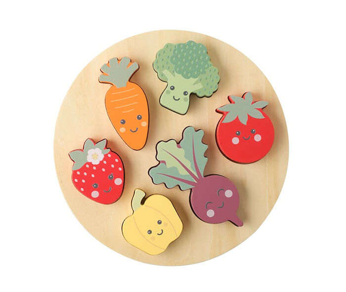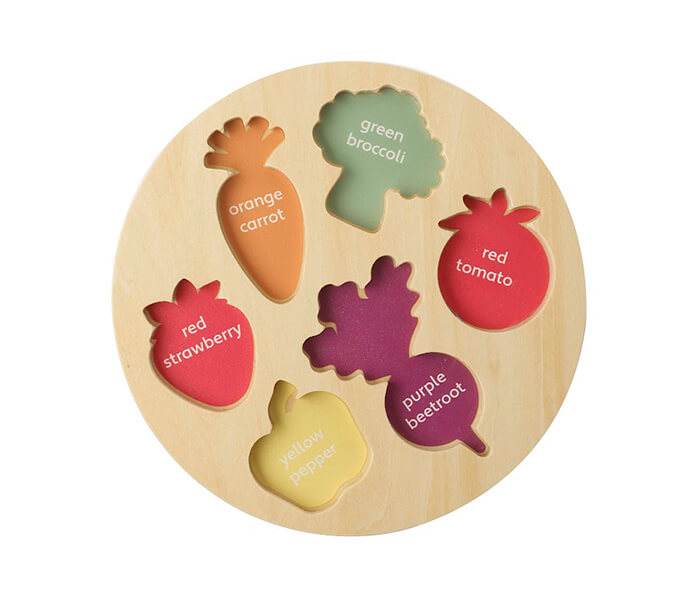 This set contains a base board and 6 differently shaped vegetables – a carrot, a broccoli, a strawberry, a tomato, a beetroot and a pepper, to slot into the right holes on the board.