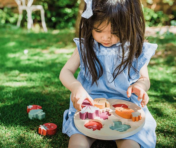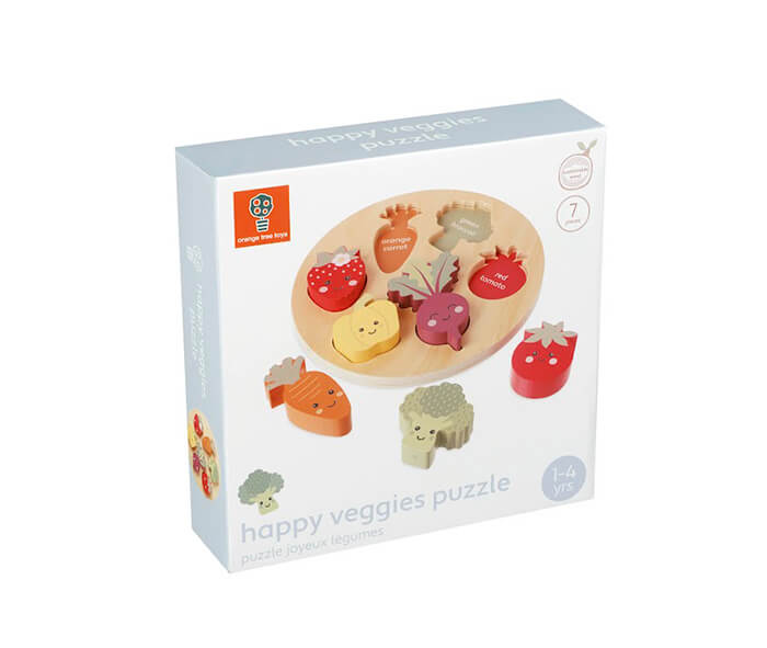 Featuring six different happy veggies, this gorgeous wooden puzzle is ideal for learning all about vegetables and encouraging healthy eating habits. Perfect for little hands, as a first peg puzzle to encourage shape sorting.