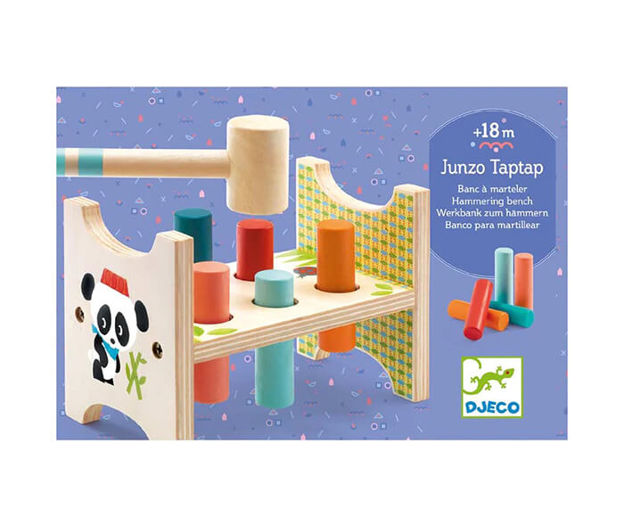 A beautifully crafted tap-tap toy made with natural wood and designed with bright colours to attract little ones to play. Place the colourful cylinders in the holes and, using the mallet, hammer them down. The best part of the engineering is that the base can be flipped over to start the fun all over again!