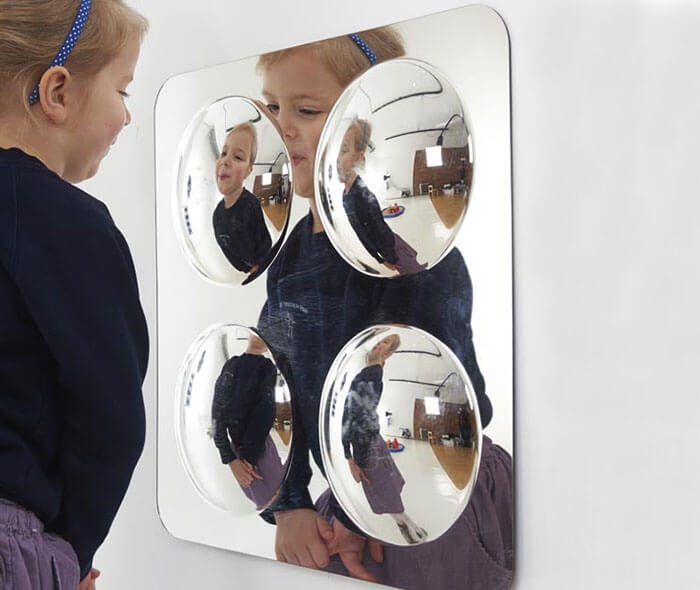 Little ones are naturally drawn to mirrors for the observation of themselves and objects. This is a set of four  domed convex mirrors providing a distorted, fun and interesting view of the world ready to be explored. There are four different mirrors – one dome, four, nine or sixteen domes, giving the opportunity to view the differing reflections. They can can sited inside or outside, making them ideal for any classroom or nursery setting.