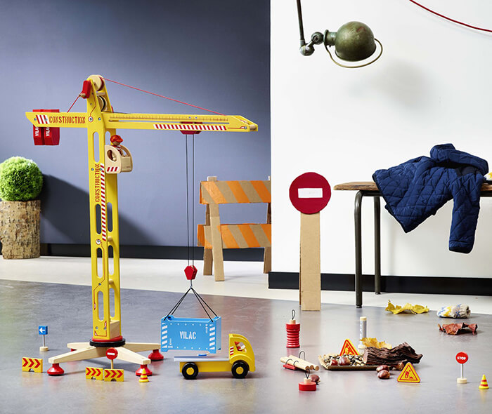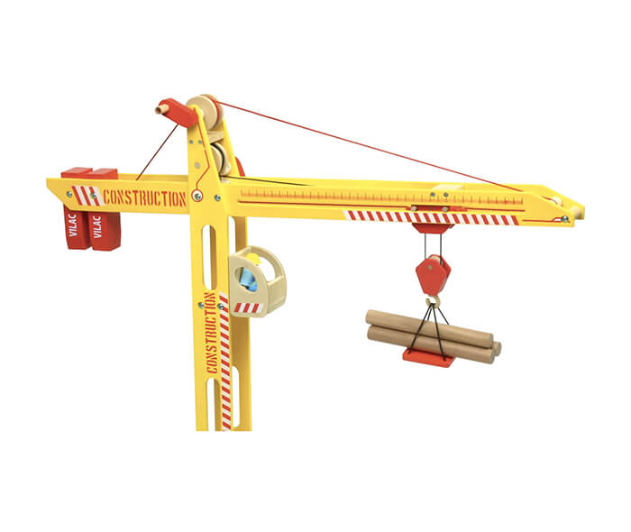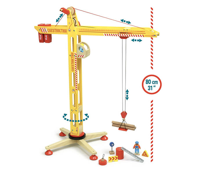 This is a fantastic bright yellow crane, perfect for lifting materials and equipment around a building site and over large constructions. There’s a winch, extendable boom and magnets to pick up the cargo, but don’t forget the workers – one down on the ground to get organised and the other in the operating box all the way up the crane! The crane also rotates on it’s base, just like the real thing. All in all this is a fantastic wooden toy for budding engineers.