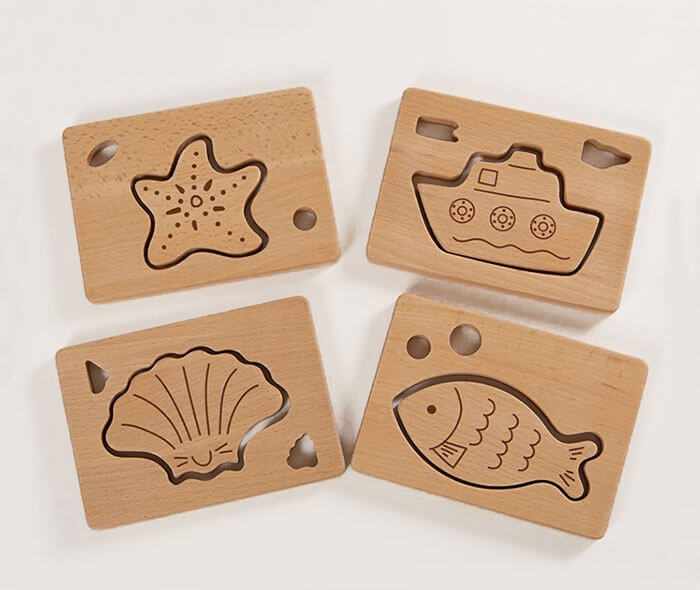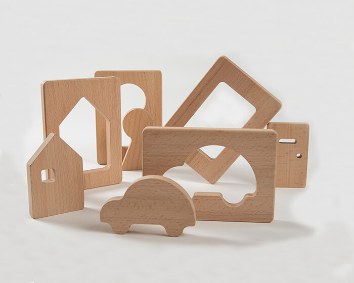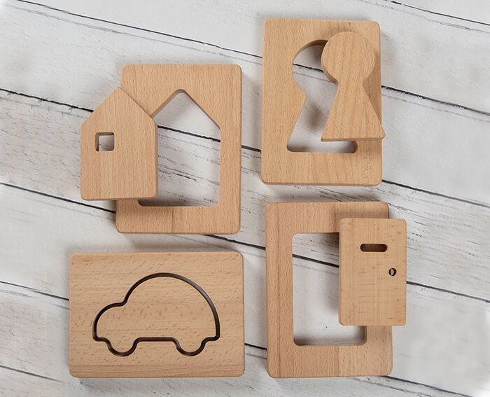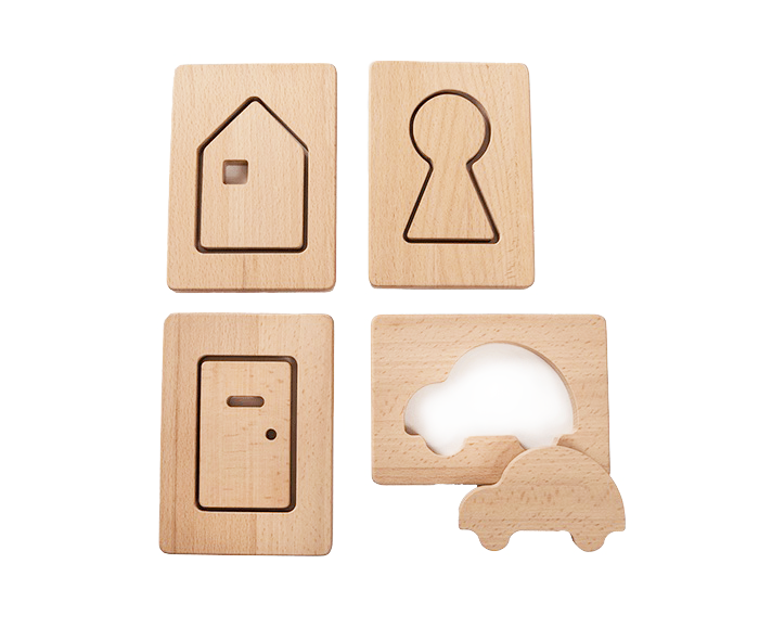 This set includes four shapes a car, a door, a key and a house. Each shape has a cut out piece which slots back inside.