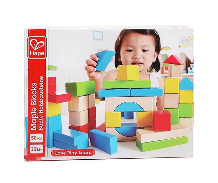 This set includes 50 wooden maple building blocks and a handy drawstring bag to store them in after play.