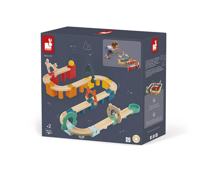 This is a colourful and exciting first ball track, with suspense and creativity guaranteed! There are 44 pieces to assemble into a real course, which has multiple possible combinations (but there are some examples provided to get you started).