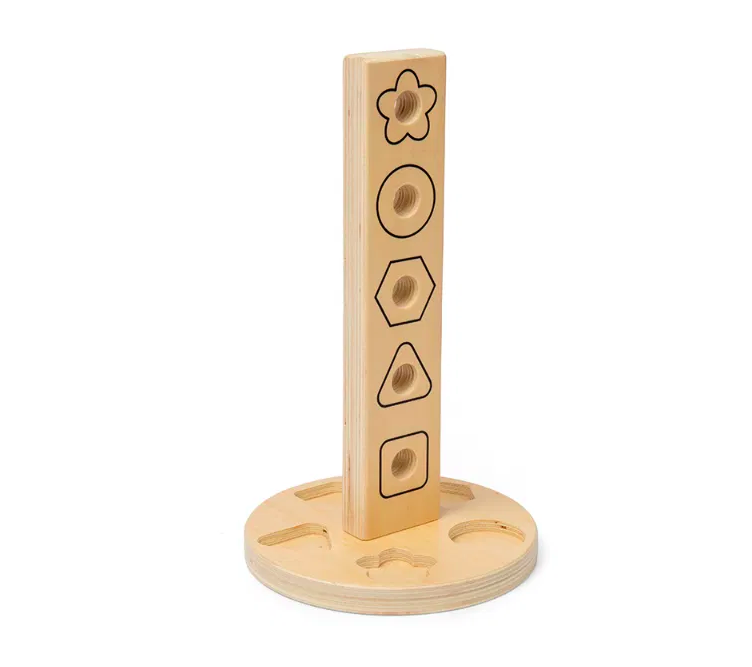 The wooden Nuts and Bolts Tower comes with 6 different shaped and coloured nuts and bolts – a star, a circle, a hexagon, a triangle and a square. The base also has a shape sorted to place the nuts and bolts in as an extra element.