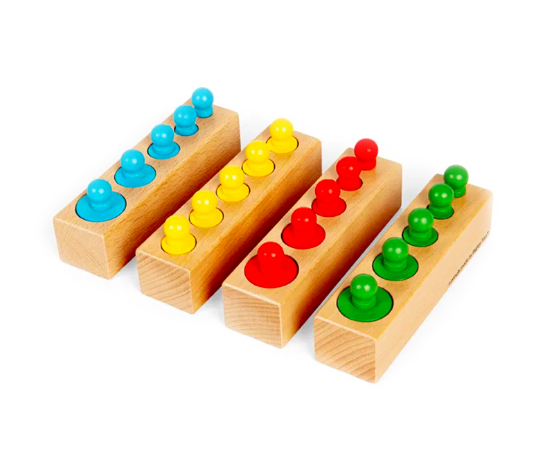 This set includes four wooden blocks each having 5 pegs of different volumes and lengths in 4 different colours – read, blue, yellow and green.