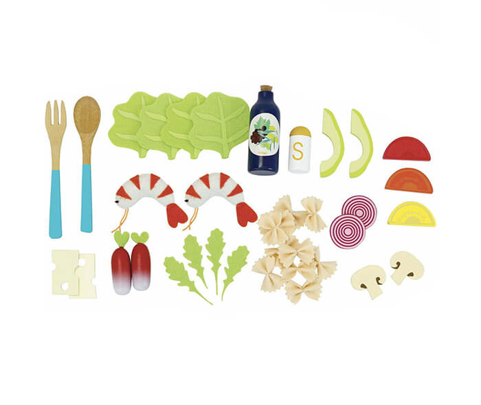This set includes a large bamboo fibre serving bowl and a salad serving fork and spoon, with a wooden salad dressing bottle and a salt pot. There are 4 lettuce leaves, 2 avocado slices, 4 slices of tomato, 2 shrimps, 11 pieces of farfalle pasta, 2 slices of onion, a slice of lemon, 2 slices of cheese, 2 radishes, 4 rocket leaves and 2 mushroom slices.