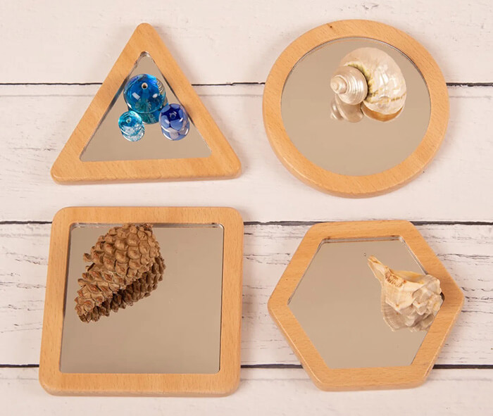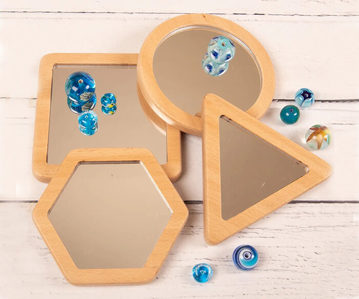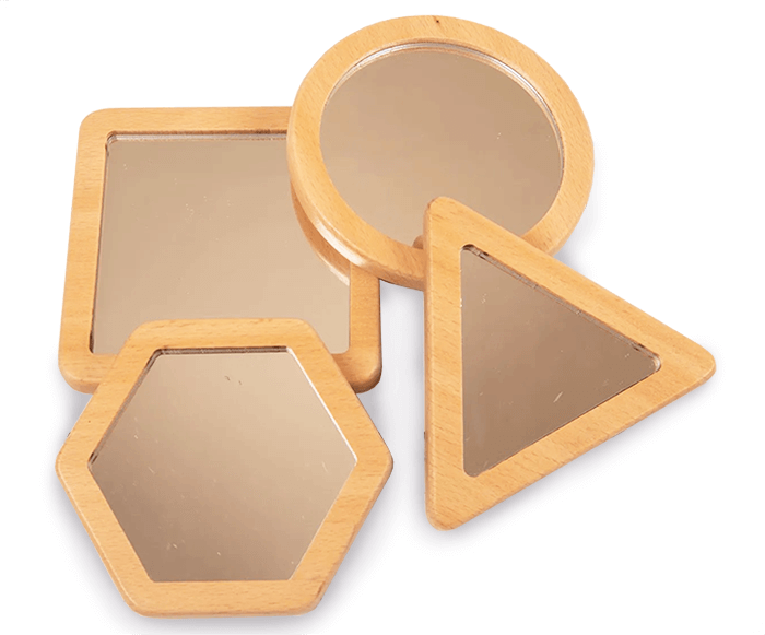 Little ones love looking at themselves in mirrors, there is a distinctive fascination with seeing their own reflection. This set of four mirrors includes a square, circle, triangle and hexagon which are light and easy to hold in small hands.