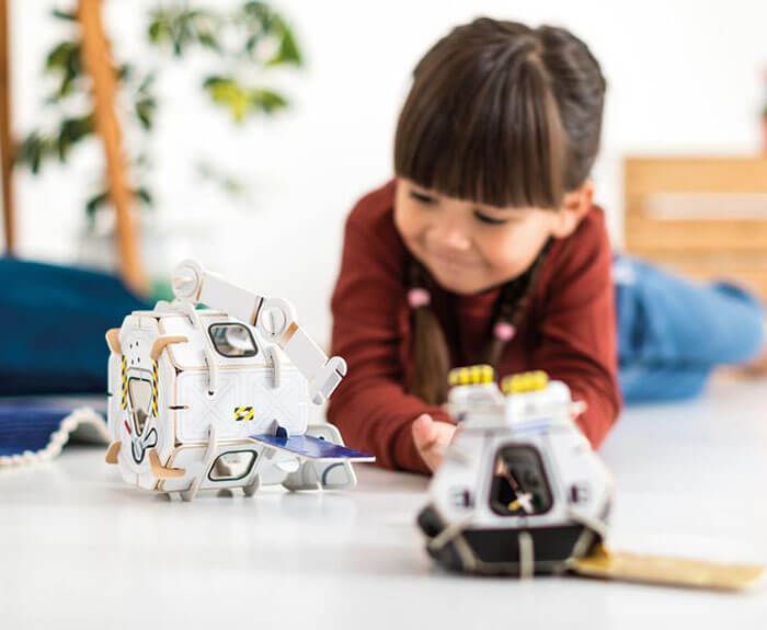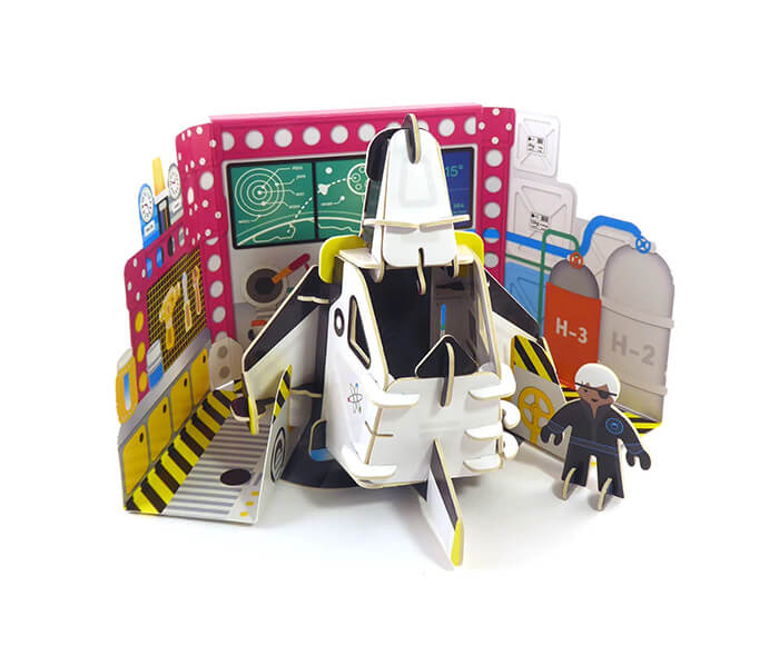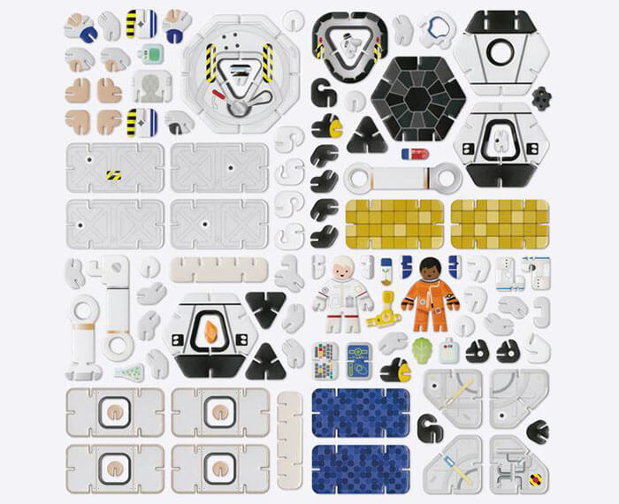Reach the earth’s outer limits with this two-part interlocking space station, with onboard laboratory, detachable capsule, fully opposable arm and two astronauts. The playboard pieces slot together, and can be brought out again and again.