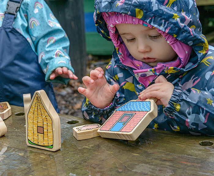 These bright and inviting wooden characters enable little ones to reenact the story of the Three Little Pigs in self-directed play and create new versions of their own during small world activities.