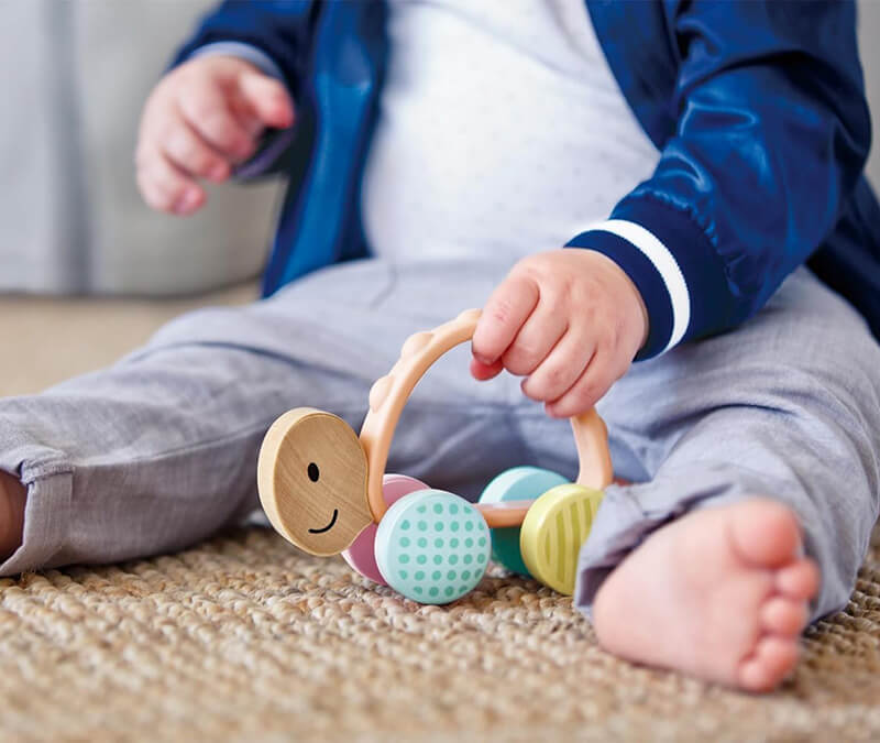 All the materials used are perfectly safe for babies to explore with their mouths. The natural rubber body is perfect for teething, while the wooden head and wheels are durable.