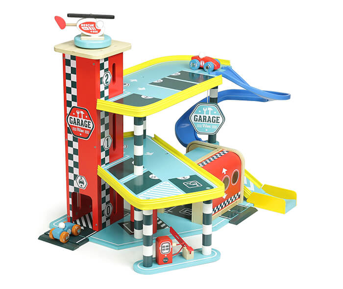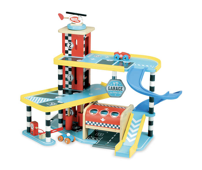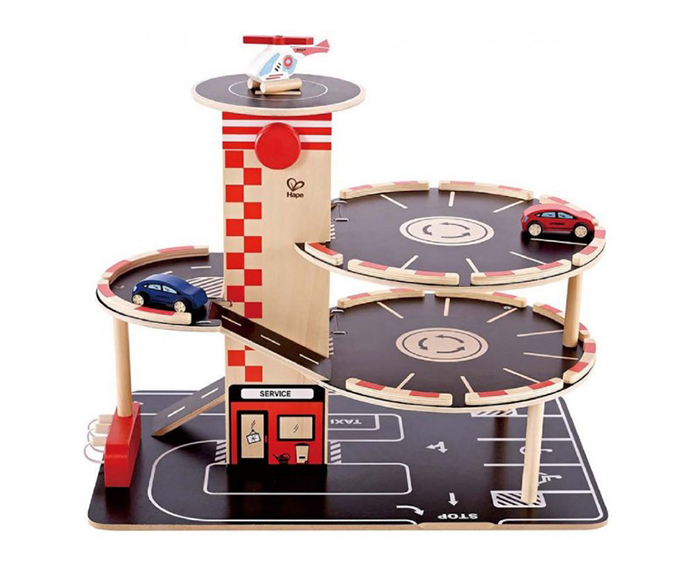 A wonderfully bright three-storey carpark/garage in tones of red, yellow and blue with accents of black and white. Each of the floors is angled to allow access for play, there’s a lift, a car ramp designed like a helter-skelter, a shutter at the entrance, a petrol pump and a helipad. It comes with two cars and a helicopter to make this a complete package for perfect small world play.