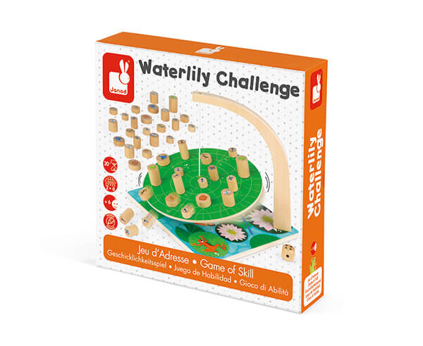 Each player takes their turn to roll the dice, and then places the corresponding, wooden animal or insect on the lily pad without making it tip over. SPLASH – oh no game lost! Careful, the loser is the one who makes the game pieces fall.