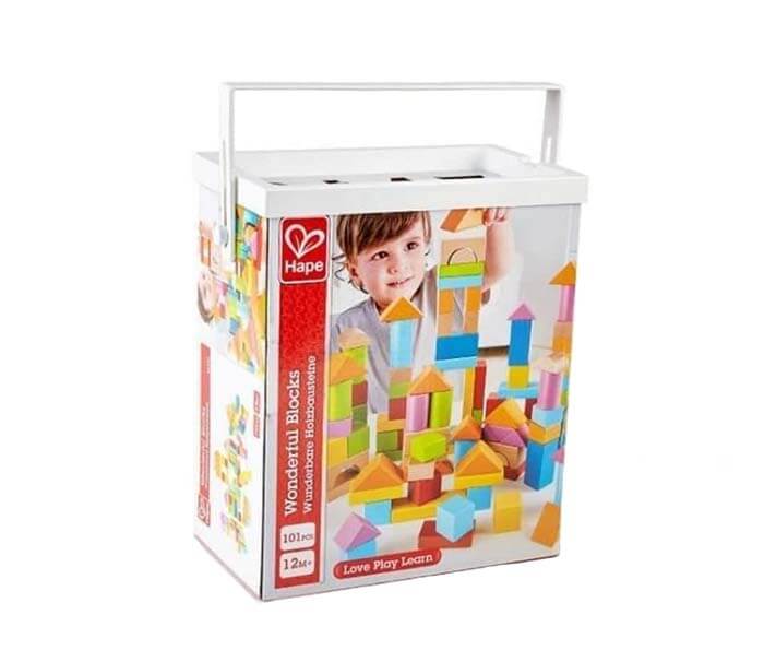 This set includes 101 wooden beech building blocks and a handy box to store them in, which has a shape sorting lid.