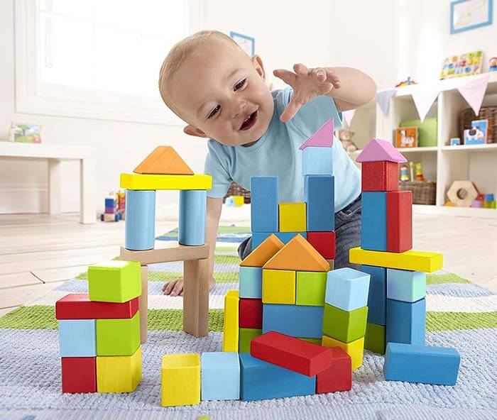 Building blocks are great for creative development, encouraging fine motor skills, beginning to understand maths and number skills and problem solving skills. You can talk about the different shapes, ask for the blue block or count up the square blocks. You could also try giving an assortment of blocks and sorting them by type or colour.