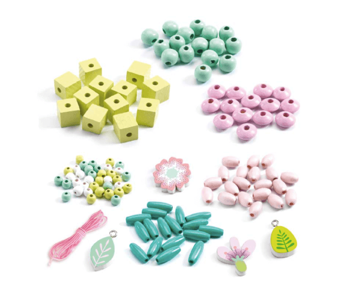 A gorgeous set of wooden beads and charms which are perfect for making pretty necklaces and bracelets. In hues of blue and green – pinks, lime, turquoise, blues and white, with various shapes and sizes. The charms include two pairs of leaves and 2 pairs of flowers. A lovely absorbing and calming activity.
