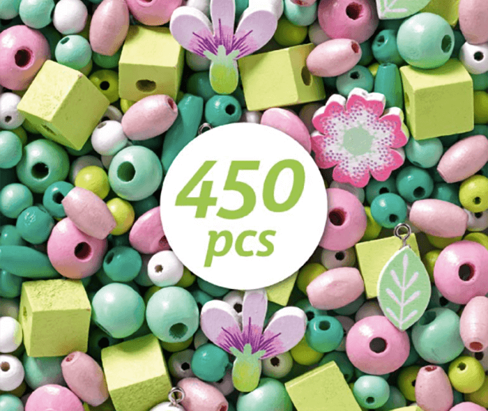 This set includes 6m of pink elastic cord, 450 wooden beads and 8 wooden charms.