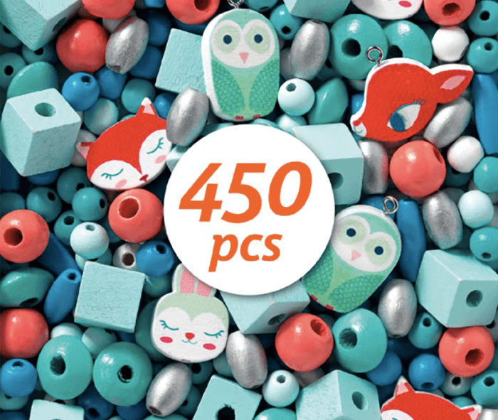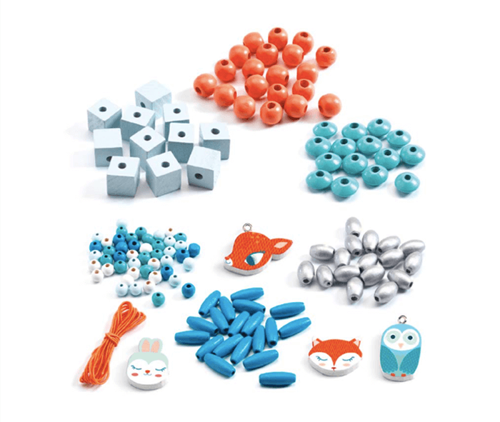 A gorgeous set of wooden beads and charms which are perfect for making pretty necklaces and bracelets. In cool blues  – powder blue, turquoise, coral, white and a sprinkle of silver, with various shapes and sizes. The charms include deers, foxes, owls and rabbits. A lovely absorbing and calming activity.