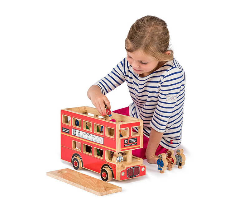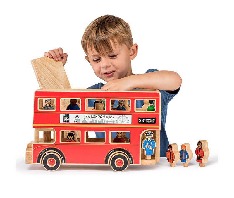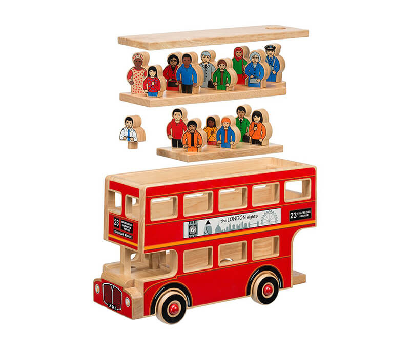 An iconic red London Routemaster bus, beautifully handcrafted making a fantastic addition to any children’s toy collection. This natural wood London bus toy is a large, deluxe size and is complete with a driver, conductor and 14 multi ethnic passengers. Children will love playing with this wooden bus, collecting the passengers from stops as the wheels go round and round.