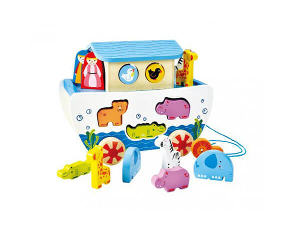 This set includes an ark with removable roof panels, boat house, deck, ramp and ladder. The 18 colourful characters are 2 pairs of gorillas, doves, giraffes, crocodiles, hippos, leopards, zebras, elephants and Mr & Mrs Noah.