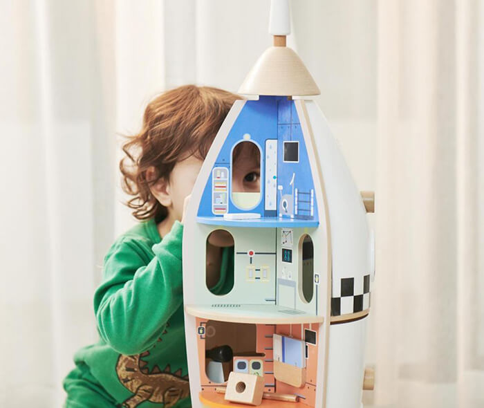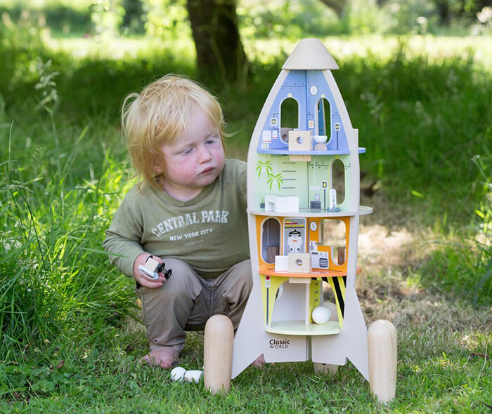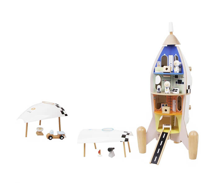 This set includes a wooden rocket ship, with removable side panels and lots of other play pieces – 51 in total