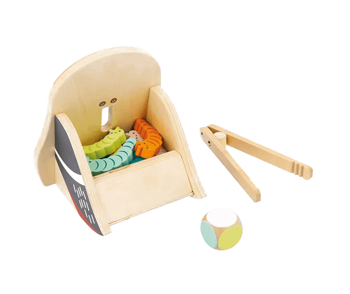 A really fun game, designed to improve colour recognition and fine motor skills through play. To play – split the caterpillars between all players, then roll the dice and if the player has that colour caterpillar they need to use the wooden tweezers to feed it to the bird, through its beak. The first player to feed all their caterpillars to the bird wins.