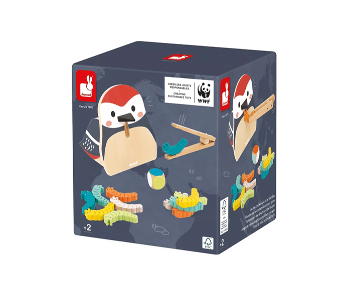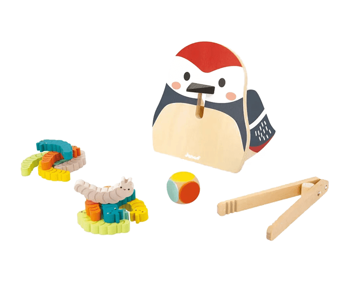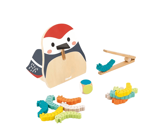 This game includes a wooden bird, a pair of tweezers, a die and 12 caterpillars in 6 different colours – 2 of each of orange, green, teal, dark green, yellow and brown.